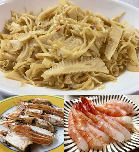 タケノコの姫皮と穂先のごま油炒め&冷凍甘エビでお刺身・殻焼き♪