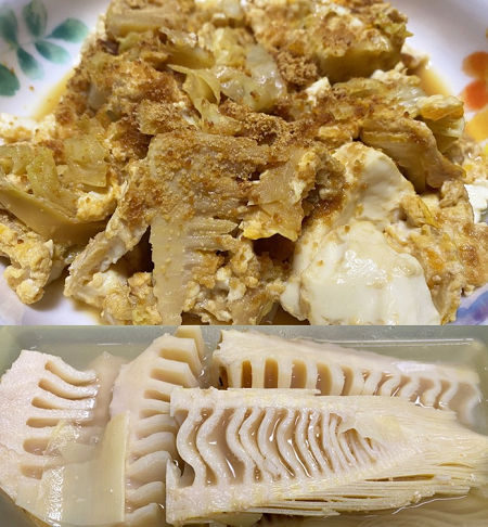 頂いたタケノコを茹でて プチっと鍋で!豆腐・タケノコ・春キャベツの卵とじ🍺 大きな···