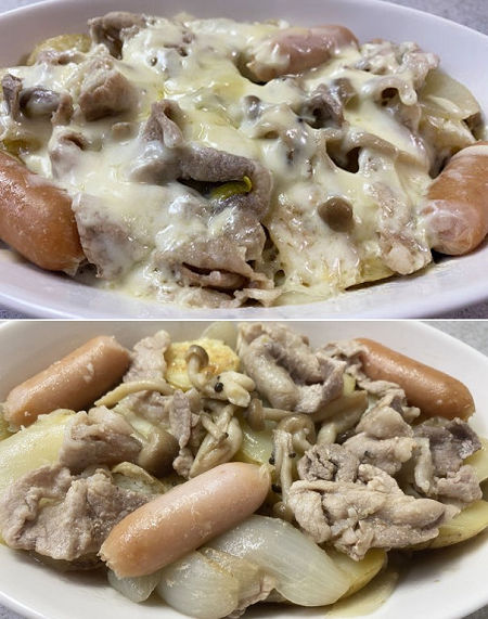 昨夜の🍺のお供 新じゃがのコンソメ煮にチーズをのせて🍺 ↑新じゃががみえてない^^···