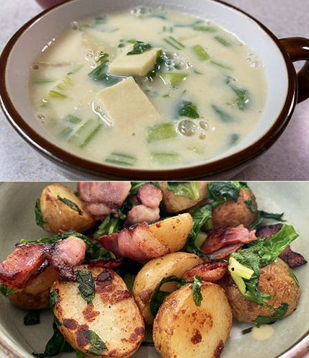 高野豆腐と豆乳の味噌汁・スープ&カリカリベーコンと新じゃがの炒め物♪