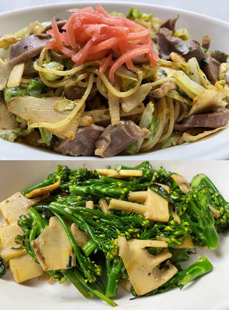 砂肝とタケノコ焼きそば&菜の花とタケノコのバター醤油炒め♪